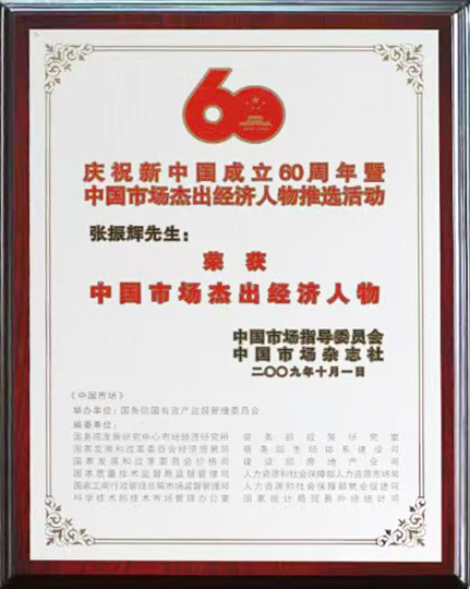 2009年10月在庆祝建国60周年由国家发改委、商务部、质检局、工商局等国务院十六部委联合开展的“辉煌60年暨中国市场杰出经济人物”推选活动中,被授予“中国市场杰出经济人物”荣誉称号。