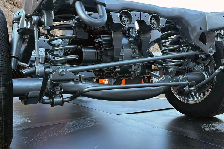 和整体桥后悬架一样,迪翁桥也是一种左右车轮硬连接的非独立后悬架,整体呈弓形桥管结构,搭配潘哈德连杆设计,从而最大限度保障底盘强度和支撑性。区别在于,其电机、差速器、半轴被固定在车架上,这最大限度减小了整体桥方案(需将电机固定在硬桥上)的簧下质量。同时,万向驱动轴也能通过动态调整车轮前束角和外倾角,从而获得更高的过弯极限。