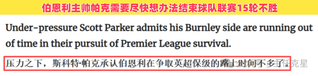 要知道,伯恩利现在深陷降级区,15场失利排倒数第二,距离安全区足足11分,保级希望看似渺茫到看不见头。