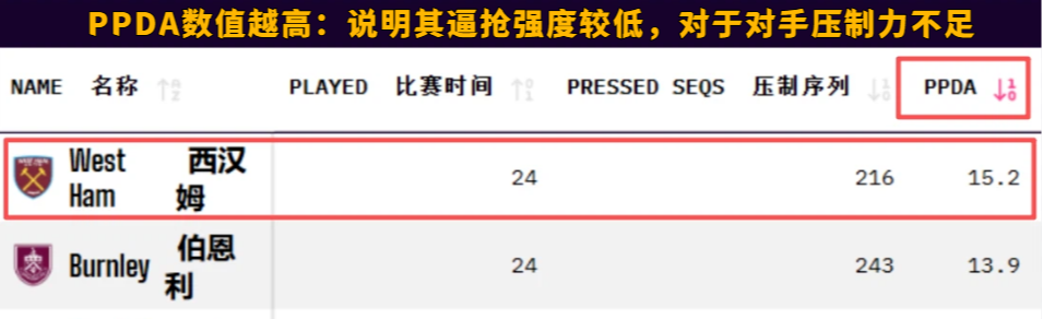 更要命的是他的战术,明明是靠防守起家的教练,麾下的西汉姆联却防线混乱到离谱——PPDA(每回合防守行动传球数)大幅上升,前场逼抢力度不足,总给对手留足出球空间,防线直接暴露在威胁之下。
