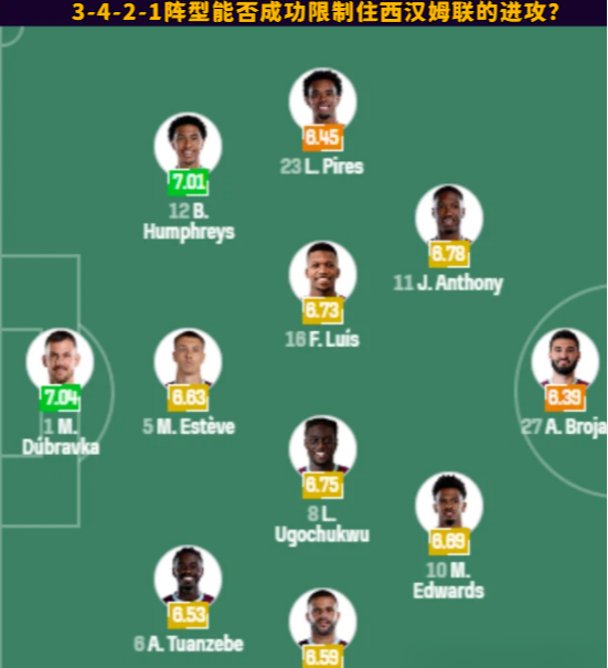 更雪上加霜的是后防线——绝对主力托迪博上轮染红停赛,要禁赛三场,本场根本上不了!这位本赛季出场20次、场均1.83次抢断、4.44次解围、2.33次争顶的后防核心一缺席,西汉姆联的防线就等于少了一根定海神针。