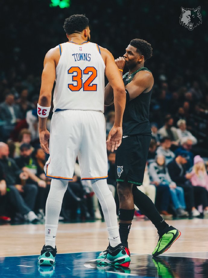 尼克斯这边,布伦森缺阵,唐斯独自带队,面对老东家也迎来大爆发,出战35分钟,24投14中,三分6投3中,罚球11中9,空砍40分13篮板的大号两双,比爱德华兹还多得了两分,也有5次失误,最后六犯离场,正负值+6。值得一提的是,这也是唐斯本赛季首次砍下40+,而且上一场对阵热火,他才仅得到2分。