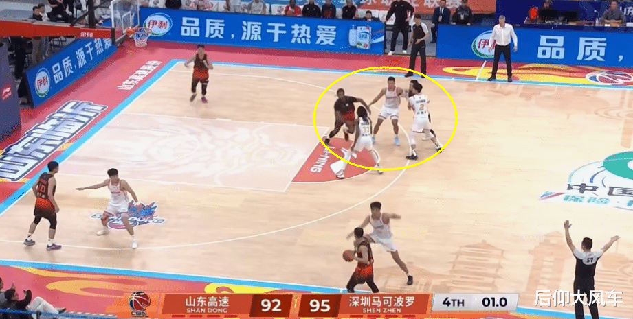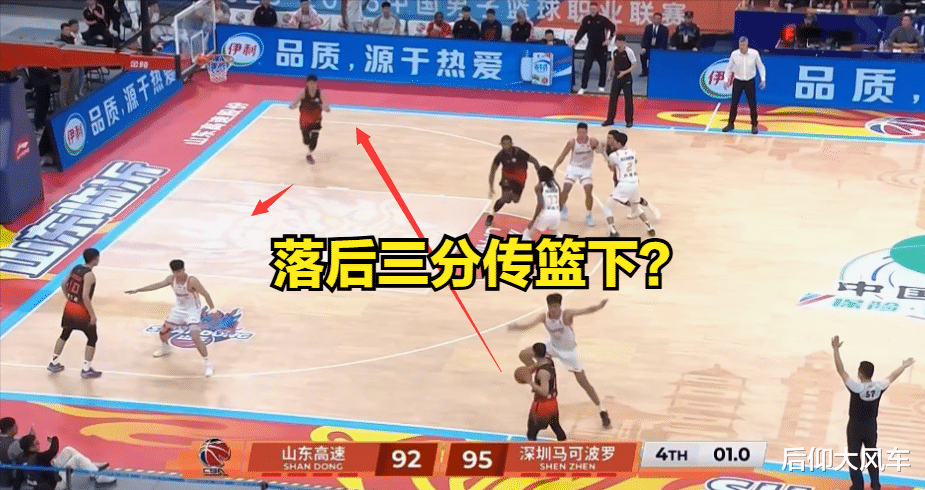谢智杰和张旭分别站住两个底角,谢智杰被深圳队一人盯住,由于深圳把防守兵力全都放在了陈林坚身上,导致张旭此时出现了大空位,此时深圳是漏了张旭,其实已经给了山东队机会了,但接下来张旭的这一波操作让人完全看不懂,明明留在底角等高诗岩长传就行了,非要跑去篮下接球,接完球后大空位上篮还没打进,比高诗岩的传球还更加抽象。