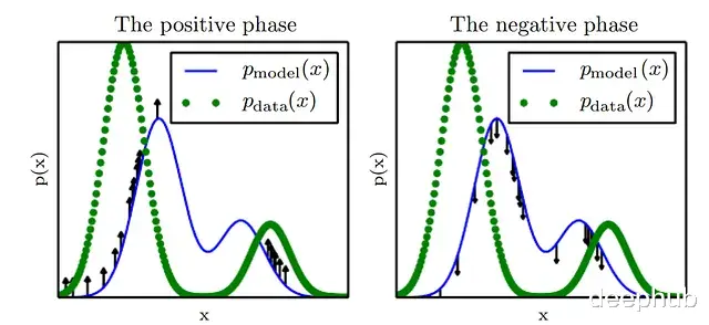 两项协同工作。第二项抵消了正阶段到处加常数的倾向,训练过程中模型与数据集的分布逐渐趋同。当二者完全相等时,正阶段在任何一点推高的力与负阶段推低的力大小相等,梯度的期望降为零,训练收敛。