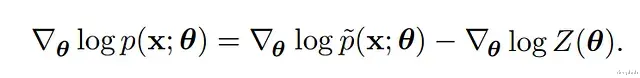 PDF p 等于未归一化的 PDF(p 上方带hash标记)除以归一化常数 Z。θ 是要通过梯度下降求解的参数集。上式对数似然的梯度展开后变成: