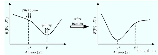 Y_i 是正确答案,Y_i 上方带hash标记的则是"最具迷惑性的错误答案",所有错误答案中能量最低的那个。在连续情况下定义正误很直观:Y_i 一定距离内的答案算正确,超出该距离的算错误。设计良好的损失函数在学习过程中会压低 E(Y_i, X_i),同时抬高错误答案的能量,尤其是 E(Y¯_i, X_i)。