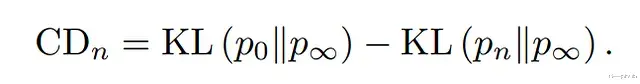 右侧第一项是数据分布与模型分布之间的"散度",即 p_0 和 p∞ 之差(至于它们为什么不直接叫 P_data 和 P_model,LeCun也没解释)。第二项是短程MCMC链——从 p_0 出发跑 n 步得到 p_n——与模型分布 p∞ 之间的散度。直觉解释见附录。