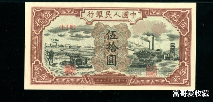 这种1948年的“50元纸币”,也属于“第一套人民币”系列,俗称:“驴子与矿车版伍拾圆”纸币。