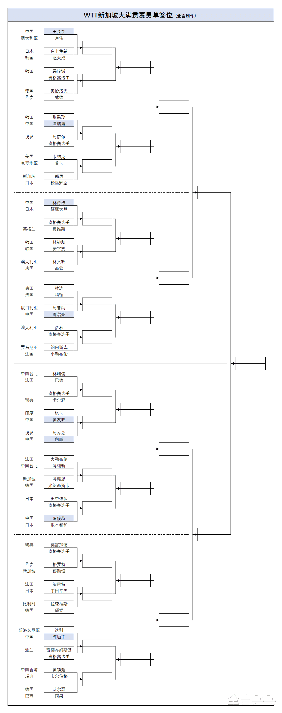 本次比赛国乒男单有8位选手参加,其中世界排名第一的王楚钦是头号种子,因此固定在上半区1号位置,而随着林诗栋排名的下滑,巴西选手雨果目前已经排名世界第二,于是成为二号种子、提前确定在下半区的64号位。