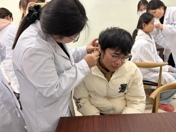 耳为宗脉之所聚,小小耳廓藏健康密码。耳诊实操现场,选手们面对模拟模特,快速开展耳穴辨识。在3分钟内,他们需精准定位指定病症对应的3个关键耳穴,并用耳豆贴清晰标注。从耳廓形态观察到穴位精准定位,从症状关联分析到辨证逻辑梳理,每一个环节都考验着学子们的专业知识储备与临床思维能力,充分展现了“精准辨证、科学施治”的中医核心素养。