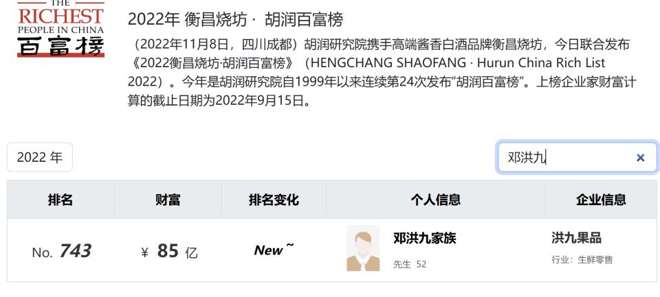 也就是在2022年,邓洪九以85亿元身家登上胡润百富榜。