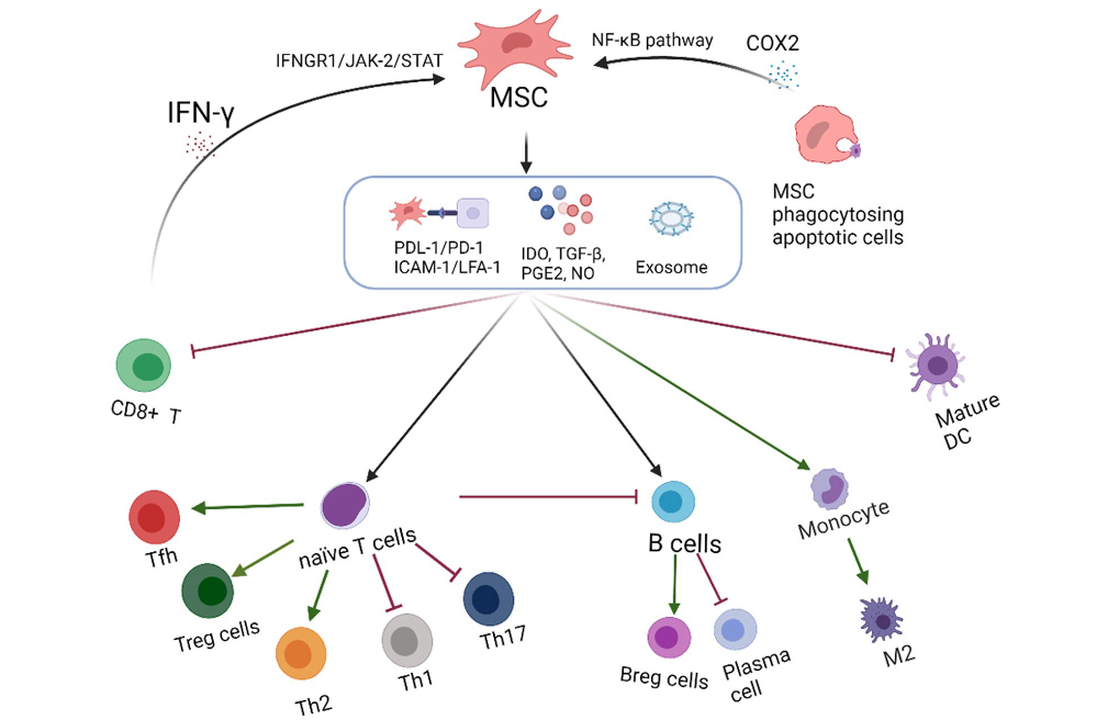 MSCs是分布于骨髓、脂肪、脐带等组织的成体干细胞,其治疗SLE的核心优势在于强大的免疫调节能力而非直接替代受损细胞。具体表现为: