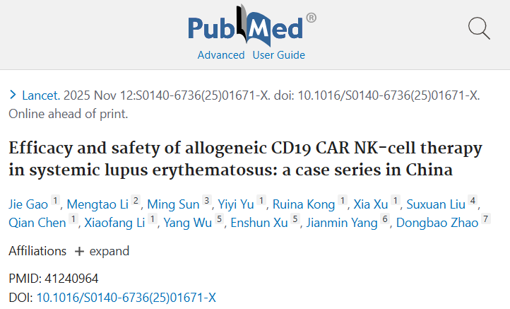 2025年11月,我国海军军医大学长海医院团队在《柳叶刀》发表全球首项同种异体CD19 CAR-NK细胞治疗SLE的临床研究。该研究采用健康供体NK细胞经基因工程改造,制备出“现货型”CAR-NK药物KN5501,靶向B细胞表面CD19抗原。