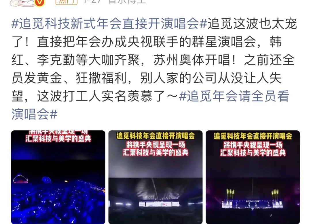 不过,新一批硬科技公司,正在接过互联网公司的接力棒,疯狂地卷起了年会,比如这两天风头正盛的追觅,就给1.8万员工办了一场演唱会。