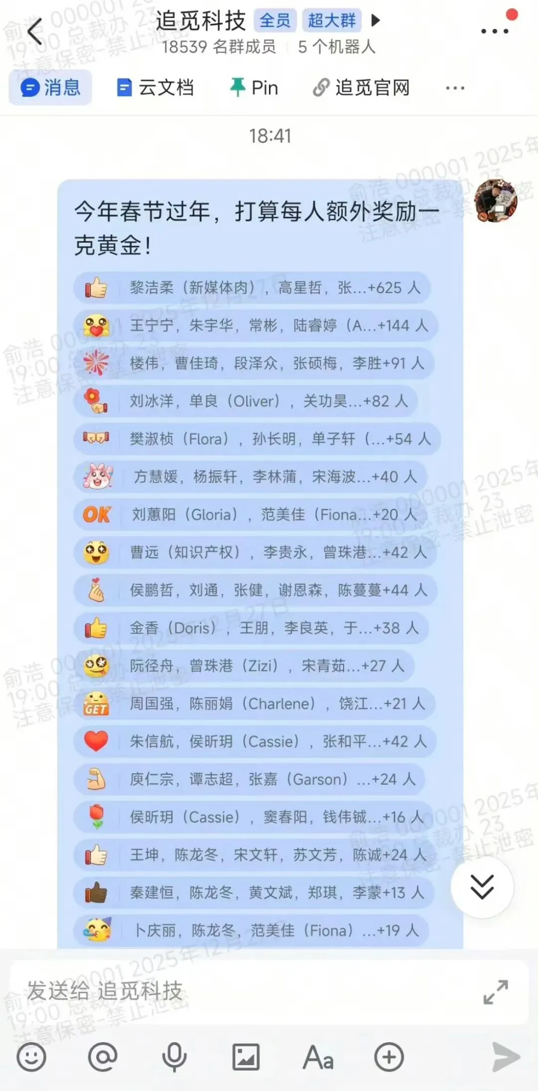 截图信息显示,18539人人人有份,按当时金价约1400元/克计算,总价值超2500万元。除黄金外,追觅还同步奖励10名员工南极游资格,并已兑现。此外在去年八月,小柴曾报道,俞浩曾在公司群发红包,一把发了两百万,人均到手188元。
