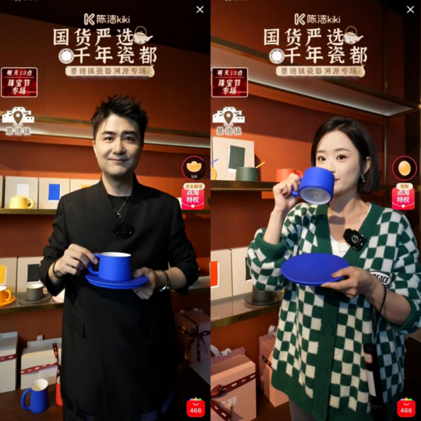 但今年,她的目光停在一个个淘宝主播的溯源直播间里。镜头里,主播在千年瓷都景德镇淘博城的店面里,摊开几十片深浅不一的釉料样品,指尖划过最浅那片最浓重的“理想蓝”时说:“这是景德镇陶瓷大学出身、从业10年以上的配釉师,调了100多次才成的颜色。景德镇工匠用传承千年的制瓷技艺打造蛋壳釉,工艺根源则是经典青花瓷。”