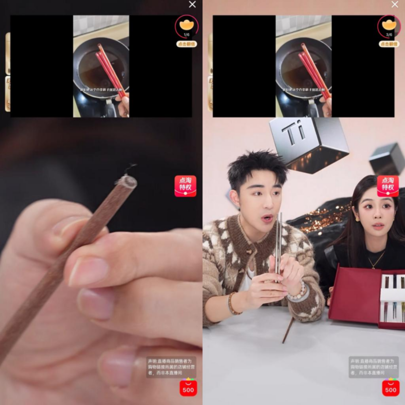 武汉宝妈李阿姨就是如此。以前她在超市买 10 元3双的木筷,用不了多久就容易发霉。双11期间,看蜜蜂惊喜社的国货严选溯源直播时,主播拿着发霉的木筷和钛筷做对比,语气实在:“这是永康产业带的纯钛筷,用的是航天级材质,不生锈、不发霉,滴上试剂就能测含钛量99.9%”,说着还拆开了工厂的检测报告,连生产时的质检流程都展示得明明白白。
