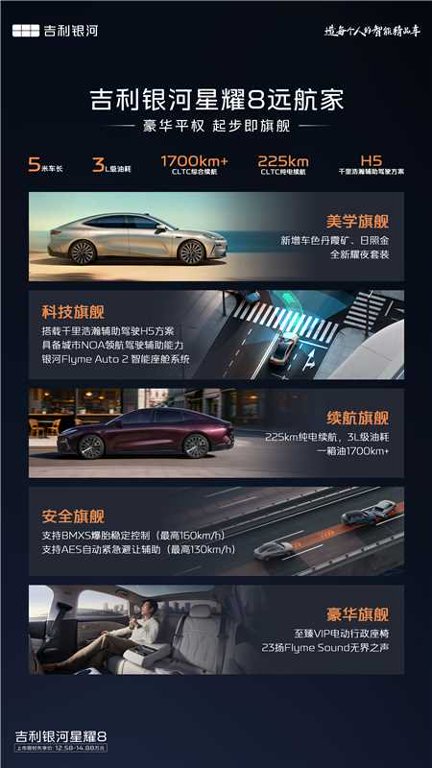 吉利银河星耀8远航家系列秉承“科技豪华平权,起步即旗舰”的理念,将越级舒享体验带入中高级轿车市场,让豪华触手可及。