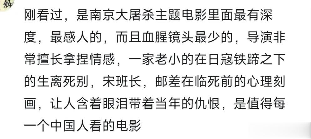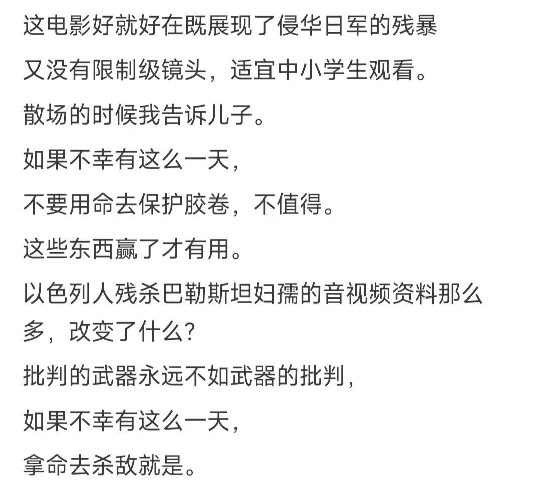 里面血腥暴力确实谈不上,可架不住有批人以此为借口举报封杀电影。说血腥暴力的先不谈,某音评论区甚至有一堆在刷“设备用的松下和索尼”来讽刺电影,可是,用好的设备些更好的表达主题不是很正常?用三八大盖打死他鬼子就不是鬼子了?还有一群人刷”我把片都删了”,再补一句“只看欧美的”,简直无语,看片还显摆上了!