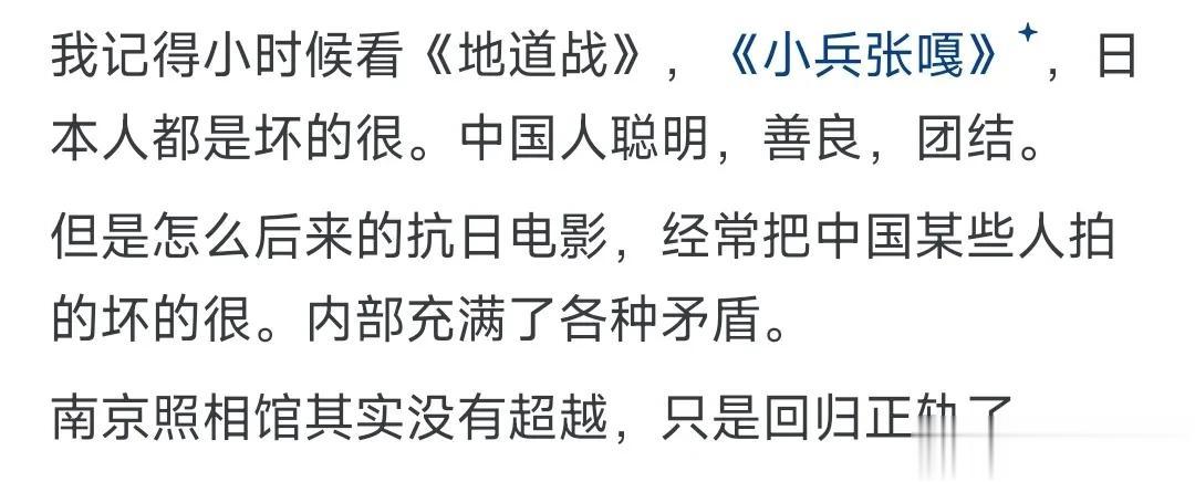 中国人骨子里把世界上的人民都看作人,而苏联修正主义,日本军国主义,美帝国主义不仅不把其他国家的人民当做人类看待,而且要把所有本国人民打造成战争的机器,资本,以及野兽,南京照相馆是希望观众看清楚日本军国主义不仅对中国人民来说是灾难,而对日本人民也是灾难,它好在展示了一个正常人是如何被军国主义异化成野兽的。