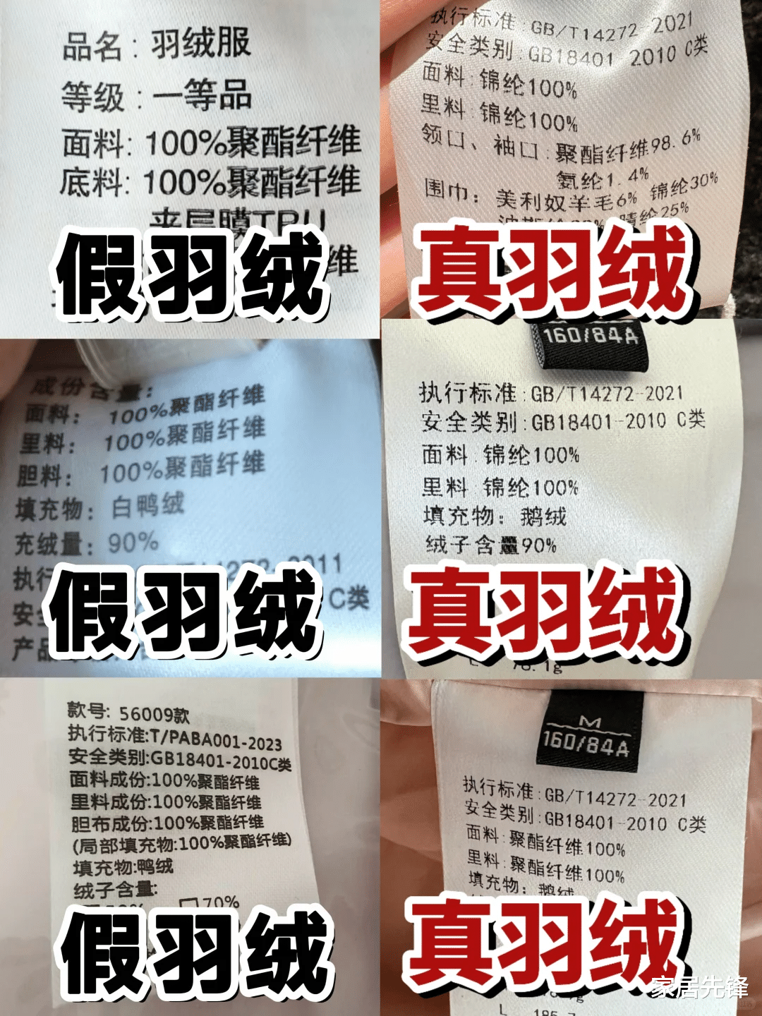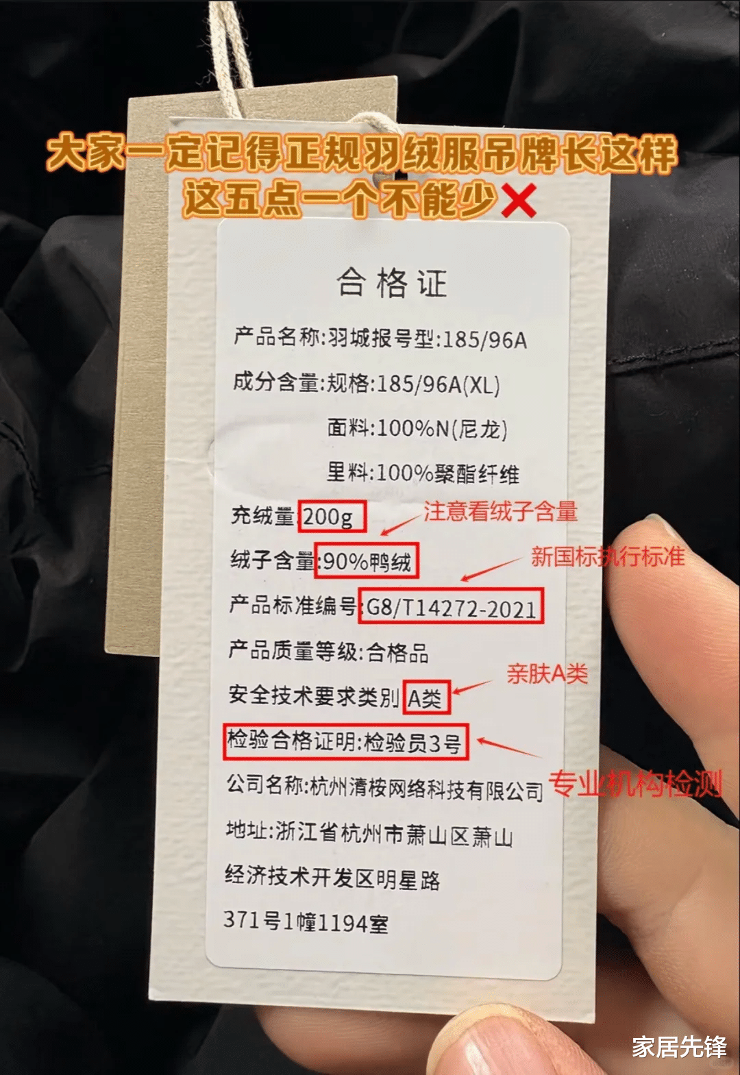 大家赶紧看看你家衣服上的吊牌,只要是22年以后买的羽绒服,上面写着含绒量,却没有写绒子含量,基本上就是库存或者是杂牌货,再便宜也不要买回家。