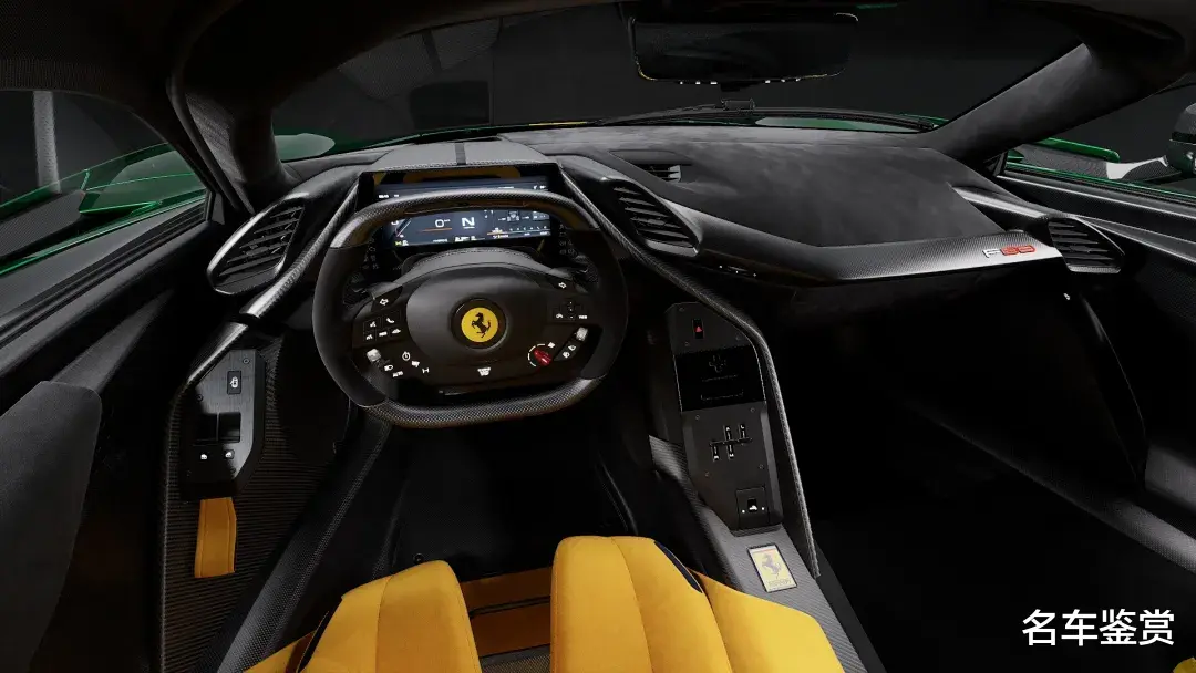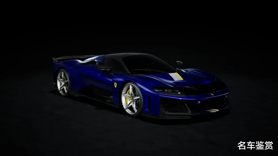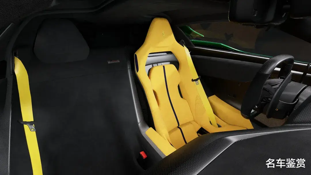 还有更多工厂精选选项,包括Alluminium Lucido搭配Giallo Modena、Bianco Italia搭配Rosso FX,以及带有酷炫灰黄条纹的Blue Elettrico搭配炭黑色。此外,还提供了Giallo Triplo Strato(法拉利黄色)、与先前法拉利超级跑车不同Rosso红色,除默认配置外,还有八种预设配置可选。