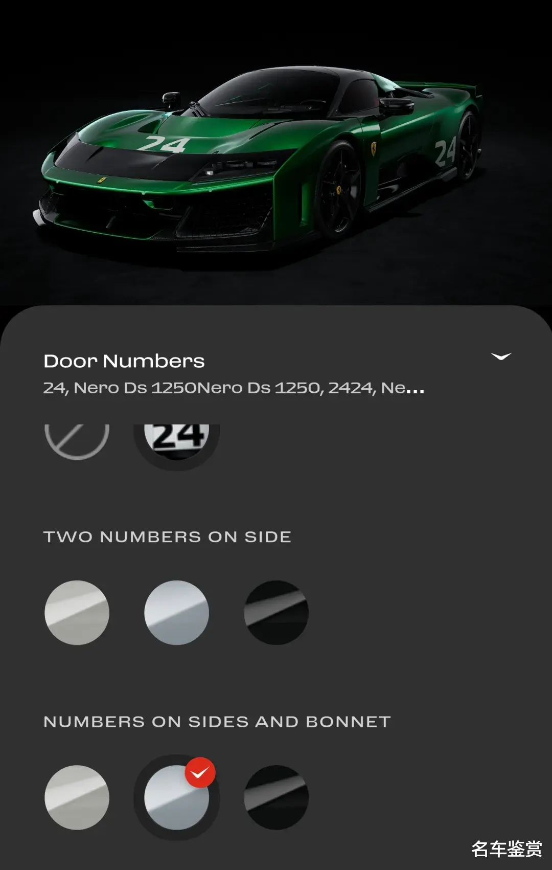 选择完颜色后,你还可以挑选车门号码。可以选择无号码、车门号码、侧面和前引擎盖上的号码。多种中心条纹选项以红色、黄色和黑色细条纹开始,搭配丰富的较粗中间条纹选择,或者你也可以选择17种色调中的任意一种作为单一粗条纹。