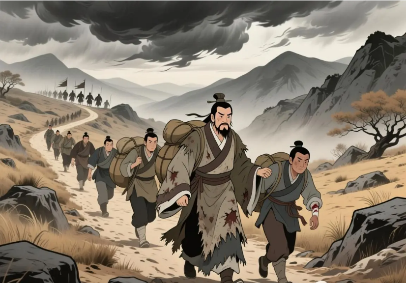 重耳逃离晋国以后,一直在狄国避难,前后有十二年光景。晋国有才能的人,象狐毛、狐偃、赵衰 cuī 、魏韡 chōu 、介子推等人都跟随着他。有一天,狐毛、狐偃兄弟俩接到父亲狐突的信,信上写道:“勃鞮三日内即去谋刺公子,速作准备。”他们赶快告诉重耳。大家商量准备逃到齐国去。第二天,重耳正在收拾行李,只见狐毛、狐偃慌慌张张地跑了进来说:“我父亲又派人送来急信,说勃鞮已经提前动身了,要咱们赶快离开。”重耳听了,扔下行李,拔腿就跑,一口气跑出了城,过了很长时间,跟随他的人才陆陆续续地赶了上来。要从狄国到齐国去,必须经过卫国。卫文公却不放重耳进城。没有办法,他们只好绕着道走。一路上无依无靠,又没有干粮,只好沿路乞讨。一天,他们走了几十里路不见人烟,太阳当头了,还没吃早饭,肚子饿得咕咕叫,看到远处大树下一伙农夫正在吃饭,高兴极了。重耳叫狐偃向他们要点吃的。衣不蔽体的农夫们望着这群贵族打扮的人说:“我们哪里有吃的!连野菜都吃不饱,哪有多余的送人呢?”另一个农夫从田里捧起一大块泥土,送到重耳面前说:“这个给你吧。”重耳大怒,拿过马鞭,就要打那个农夫。狐偃看到农夫们一个个怒目相视,急忙劝阻说:“要弄点粮食不难,要弄块土地恐怕就难了。老百姓送给我们泥土是好兆头啊!这是上天借他们的手给我们的恩赐,得土意味着得国啊!”重耳只好忍气上车,向前赶路。他们饥一顿饱一顿,不知走了几天几夜,才到了齐国。