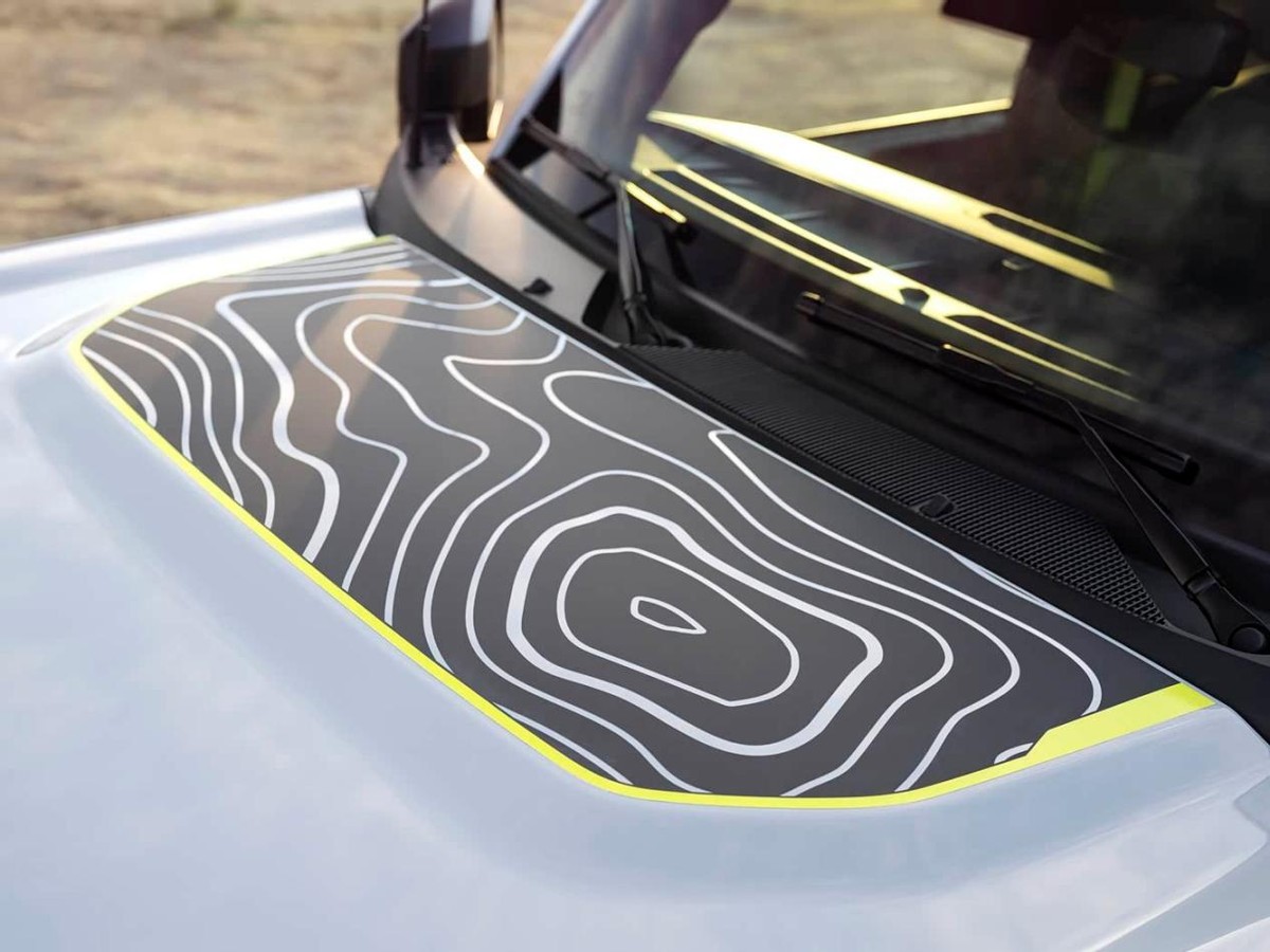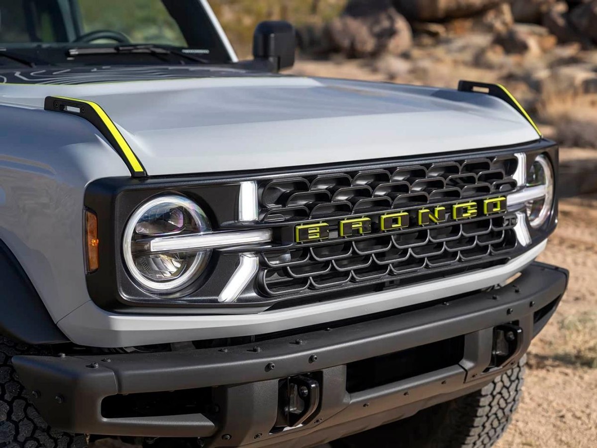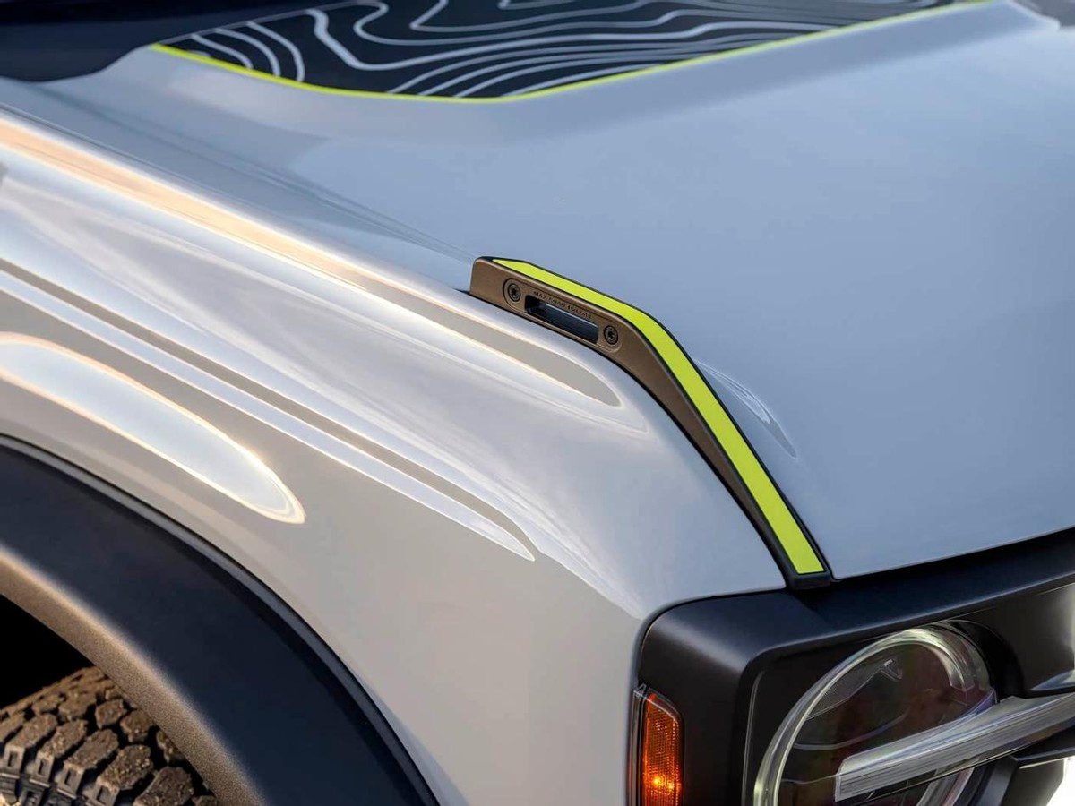 根据官方公布信息看,烈马Bronco RTR整车还是经典的方盒子轮廓,配备了复古的圆形大灯以及背负式备胎,看起来硬气十足。稍有不同的是,烈马Bronco RTR采用了比较清爽的灰色车漆,搭配机盖两侧、轮圈等处超亮的青柠色装饰,有一种硬派越野和运动碰撞的感觉,视觉效果相当不错。