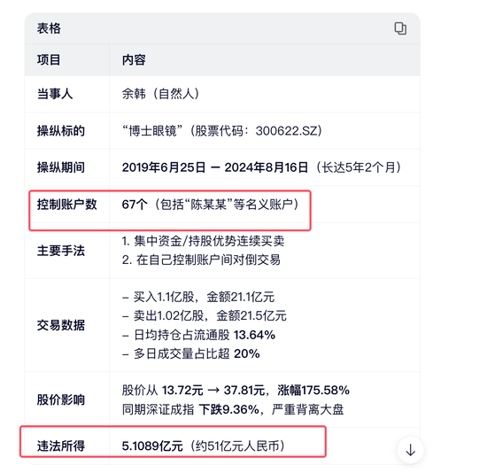 楼上的人又出手了,村里发出 2026 年 1 号处罚决定:余韩控制67个账户操纵“博士眼镜”,被处10.2亿元罚没+3年双禁入!
