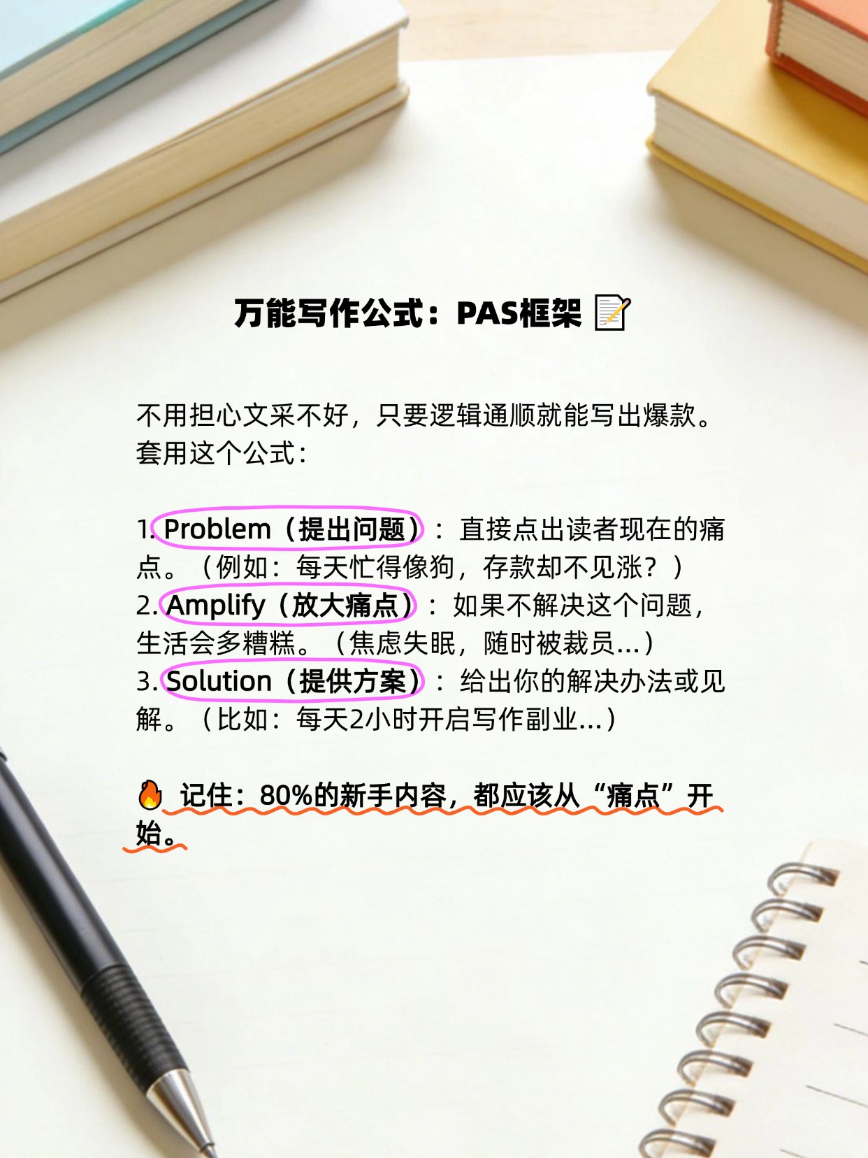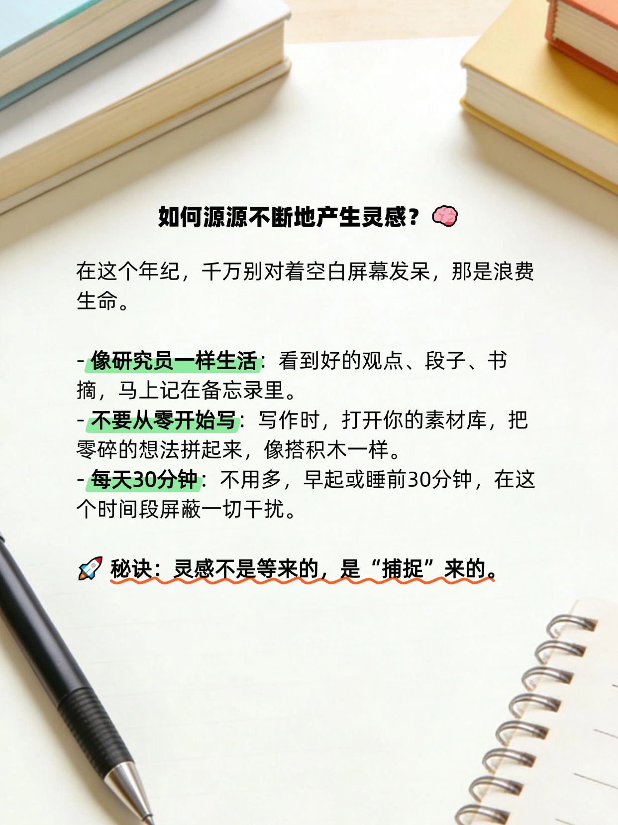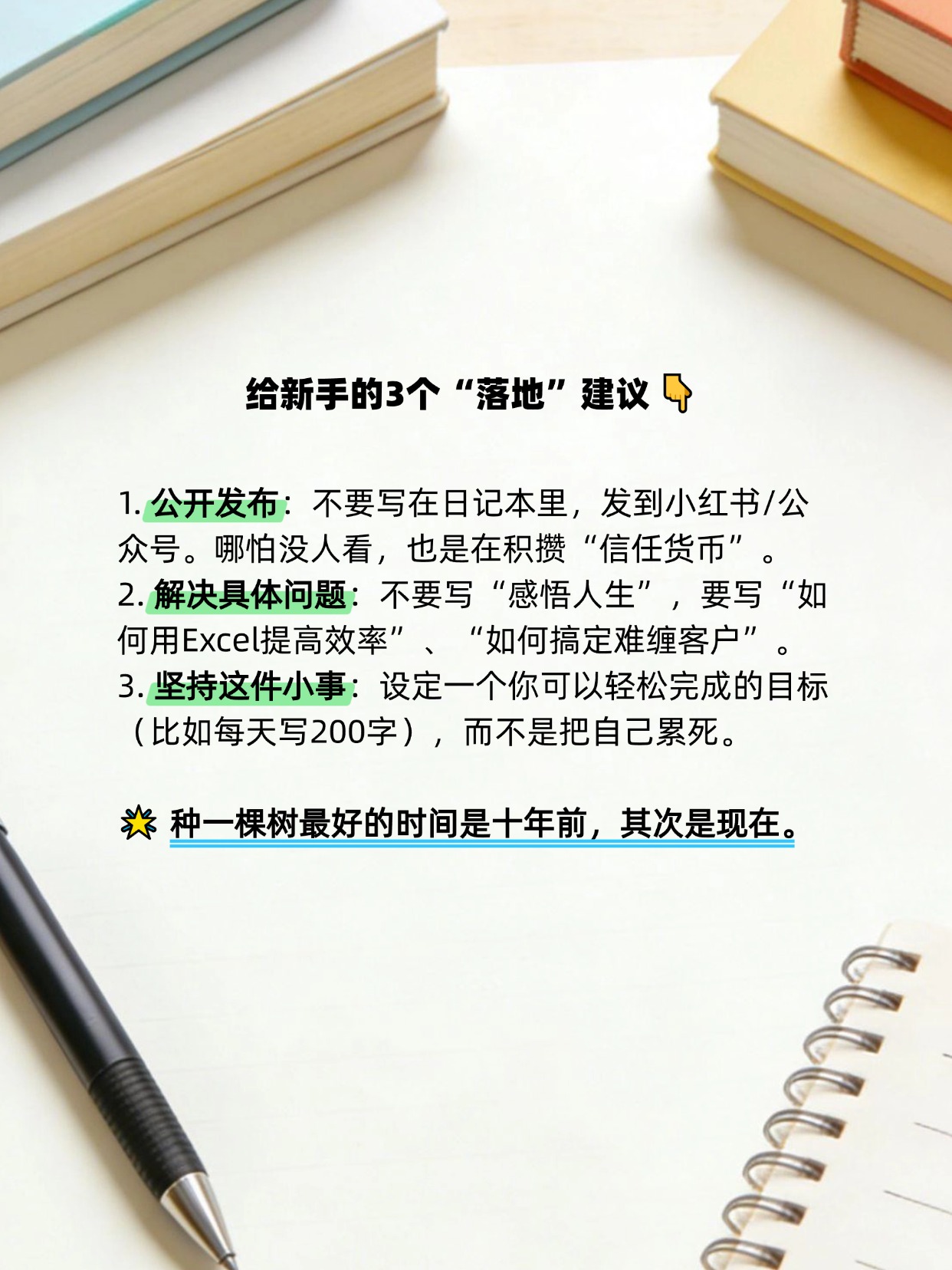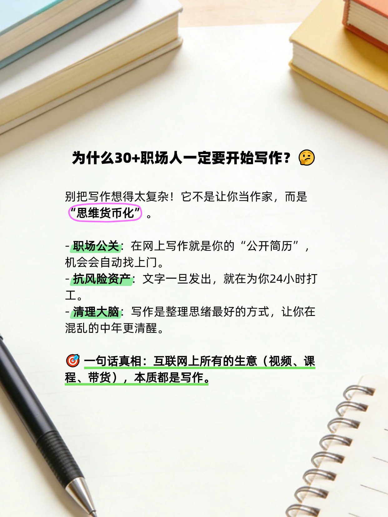 人到30岁,职场危机感扑面而来。想搞副业?想打造个人IP?其实门槛最低、天花板最高的路,就是写作。✍️不要觉得写作需要文采斐然,那是学生时代的误区。在互联网时代,写作就是“把话说清楚”,是“解决问题”,更是你在这个数字世界的“资产证明”。💰分享国外博主Dan Koe的《新手写作终极指南》,我把里面最适合职场人的干货提炼出来了:1️⃣ 写作是所有生意的地基:无论是做短视频还是做咨询,底层逻辑都是文案。2️⃣ 做“唯一的你”:不要刻意去模仿别人,你的经历、你的坑、你的经验,就是最好的素材。3️⃣ 写给过去的自己:把你解决过的问题写出来,一定有人需要这个答案。如果你正感到迷茫,不妨试试从今天开始,每天写200字。这可能是你对抗中年焦虑最锋利的武器。🛡️