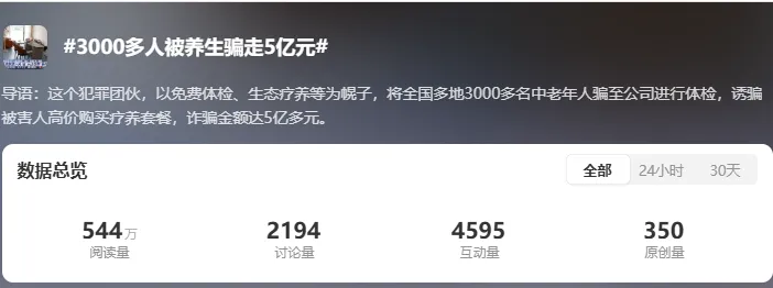 然而,每天遛鸟跳广场舞的大爷大妈们,一被骗就是几十万上百万,好比今天的一个热搜话题——3000多人被养生骗走5亿元。