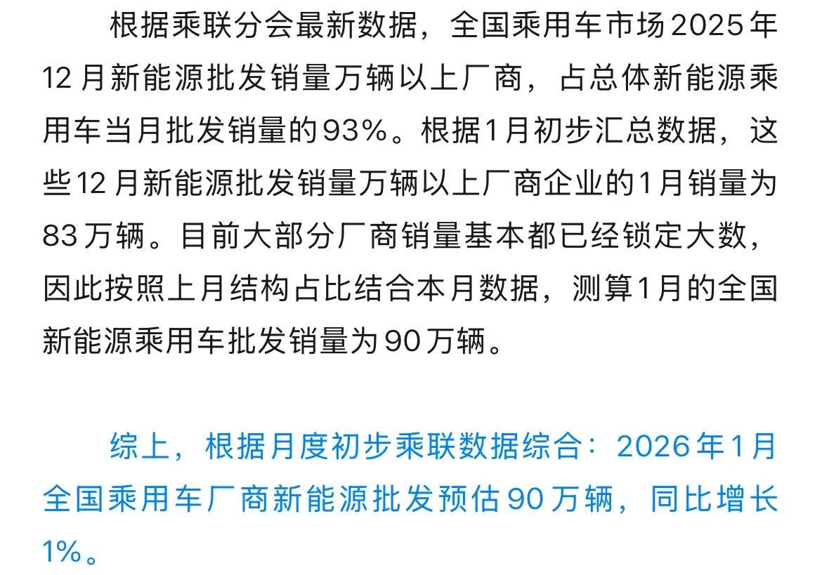 另外,2026年1月份全国乘用车新能源的批发预估为90万辆,还是同比增长了1%。