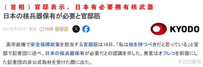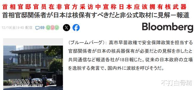 日本官员公开叫嚣要造核武器了!据彭博社、共同社等多家媒体12月19日的消息,高市政府负责安全政策的官员昨天向媒体表示,鉴于日本面临“严峻的安全保障环境”,他认为“日本必须拥有核武器”。