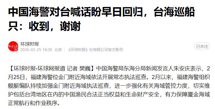 【环球时报-环球网报道 记者 樊巍】中国海警局东海分局新闻发言人朱安庆表示,2月25日,福建海警位金门附近海域依法开展常态执法巡查。2月以来,福建海警组织舰艇编队持续加强金门附近海域执法巡查,进一步强化有关海域管控力度,切实维护包括台湾地区在内的中国渔民合法正当权益和生命财产安全,有力保障厦金海域正常航行和作业秩序。