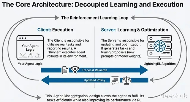 执行与训练解耦则是指智能体的推理执行和强化学习训练在架构上分离。智能体正常处理业务请求,训练模块在后台异步收集反馈、更新策略。这种设计保证了生产环境的稳定性,同时支持持续优化。