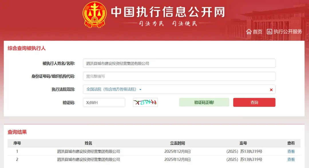值得关注的是,泗洪城投集团深陷法律纠纷。截至2026年2月2日,中国执行信息公开网显示,泗洪城投集团累计已有1条被执行人记录。具体来看,2025年12月8日,江苏省宿迁市中级人民法院将泗洪城投集团纳入被执行人名单,被执行金额高达633.59万元,案号为(2025)苏13执319号。