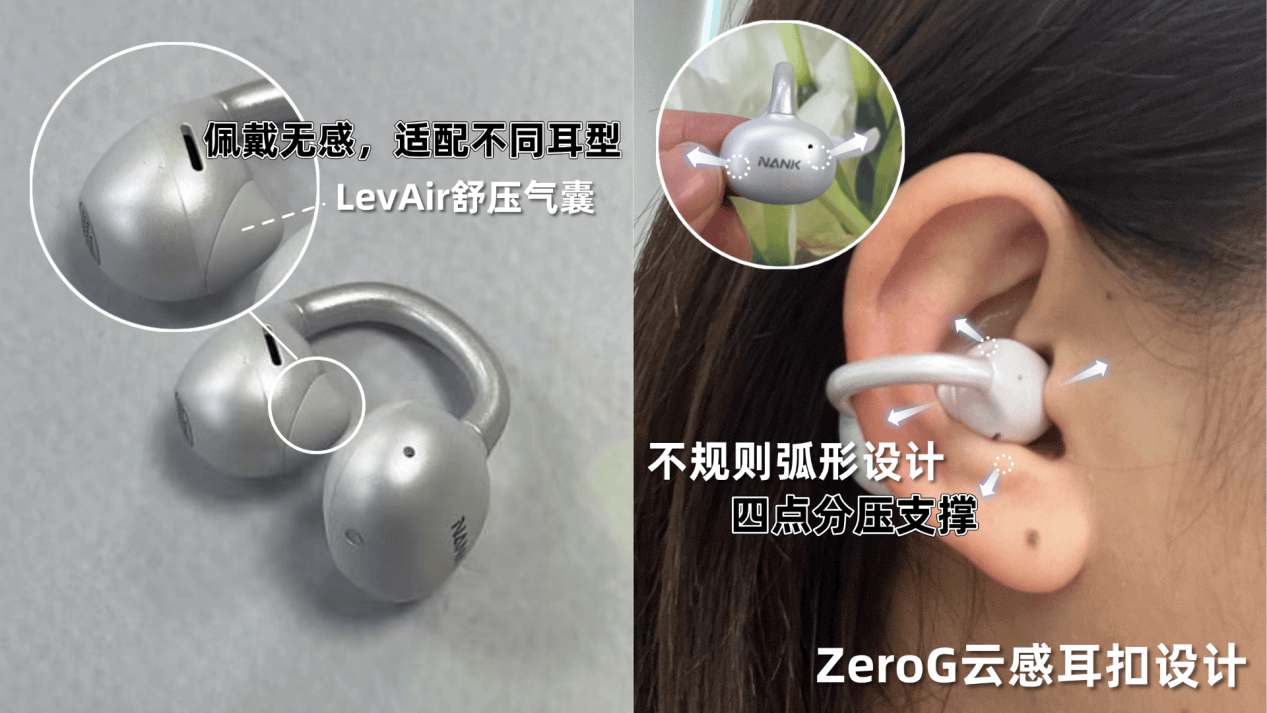 南卡ClipSuper2在开放式耳机领域做了真正的“革命性进化”,从佩戴舒适度、声音表现到智能交互体验全面拉满。它通过创新的ZeroG云感悬浮耳扣与LevAir气囊设计,将传统耳夹式耳机的痛点彻底解决:结构上采用不对称四点支撑配合微气压缓冲,让单耳重量降至仅约4.8g,贴合耳廓如同“悬浮”一般,长时间佩戴几乎无压迫感,即便是在剧烈运动、跑步、跳跃中也能稳固不滑落。连接桥则用航空级钛合金骨架搭配高分子记忆材料,具备极高的耐用性与弹性,实测超过10,000次弯折仍不变形,兼顾了舒适、稳固与耐用三者。