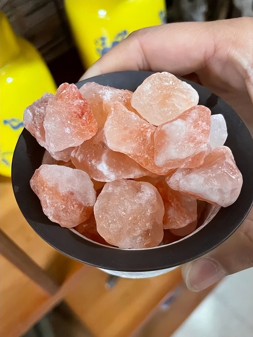 和普通食盐的白色颗粒不一样,它带着淡淡的粉色,有的还被做成盐灯、盐块的造型,单看外观就很特别。