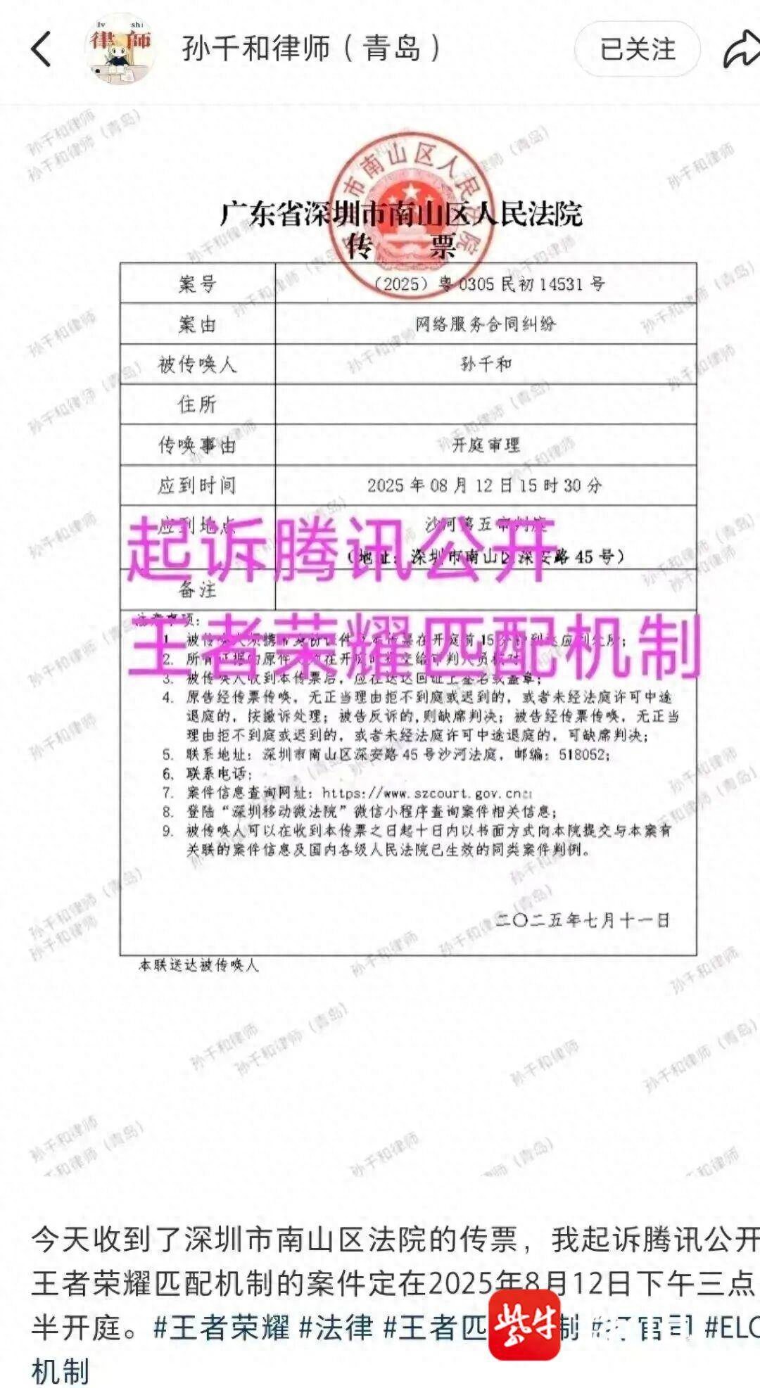 “打王者荣耀总是被匹配机制所套路!”这是青岛律师孙千和作为老玩家发出的感慨。她从2017年接触该游戏,到如今已经是王者水平,但她仍觉得,王者荣耀的匹配机制会在玩家玩了一段时间后,故意匹配比较菜的队友,导致输掉战局;在连续输了多局之后,又会匹配到高手“带飞”,这种把玩家“玩于股掌”之中的机制十分不公平。她在和身边的玩家交流后,发现不少人有同感,于是2024年6月,孙千和向深圳市南山区人民法院提交起诉状,起诉深圳市腾讯计算机系统有限公司、腾讯科技(成都)有限公司,请求判其公开《王者荣耀》的玩家对局匹配机制。2025年2月18日,法院正式立案。同年8月12日,该案在深圳开庭。一审并未当庭宣判,2026年1月22日,南山区法院将案由从原本的“网络服务合同纠纷”变更为“数据纠纷”。孙千和告诉记者,让她欣慰的是,案由变更意味着未来更多游戏玩家遇到代练封号、账号被盗、游戏道具被删,或是像她这样质疑算法公平性时,都能找到精准的案由起诉。