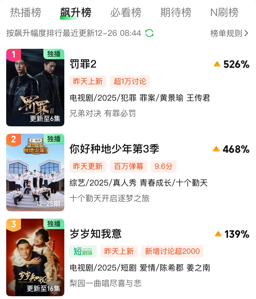 就在观众快对扫黑剧失去期待时,2025年末《罚罪2》突然空降开播,上线就成功拿下了飙升榜榜一,用一场惊心动魄的开局,宣告扫黑剧的王者归来。