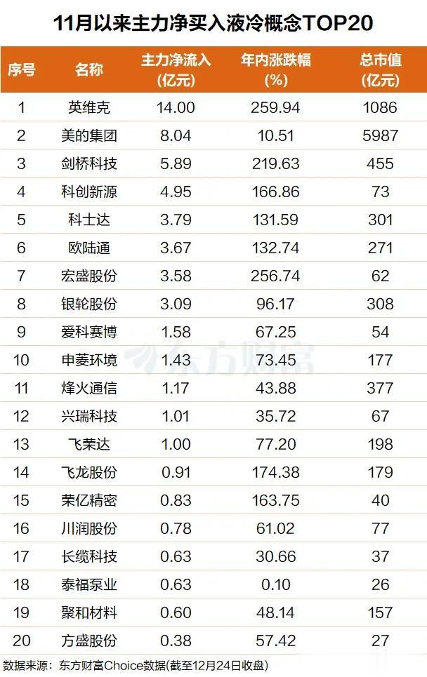 巨头都在抢赛道,主力资金自然也没闲着。东方财富Choice的数据摆在那儿,11月到现在,主力可是真金白银在买买买。谁最香?英维克!主力净买入高达14亿元,断层第一。老牌家电巨头美的集团也排第二,买了8个多亿。剑桥科技、科创新源、科士达这些,也都抢筹了几亿到几千万不等。