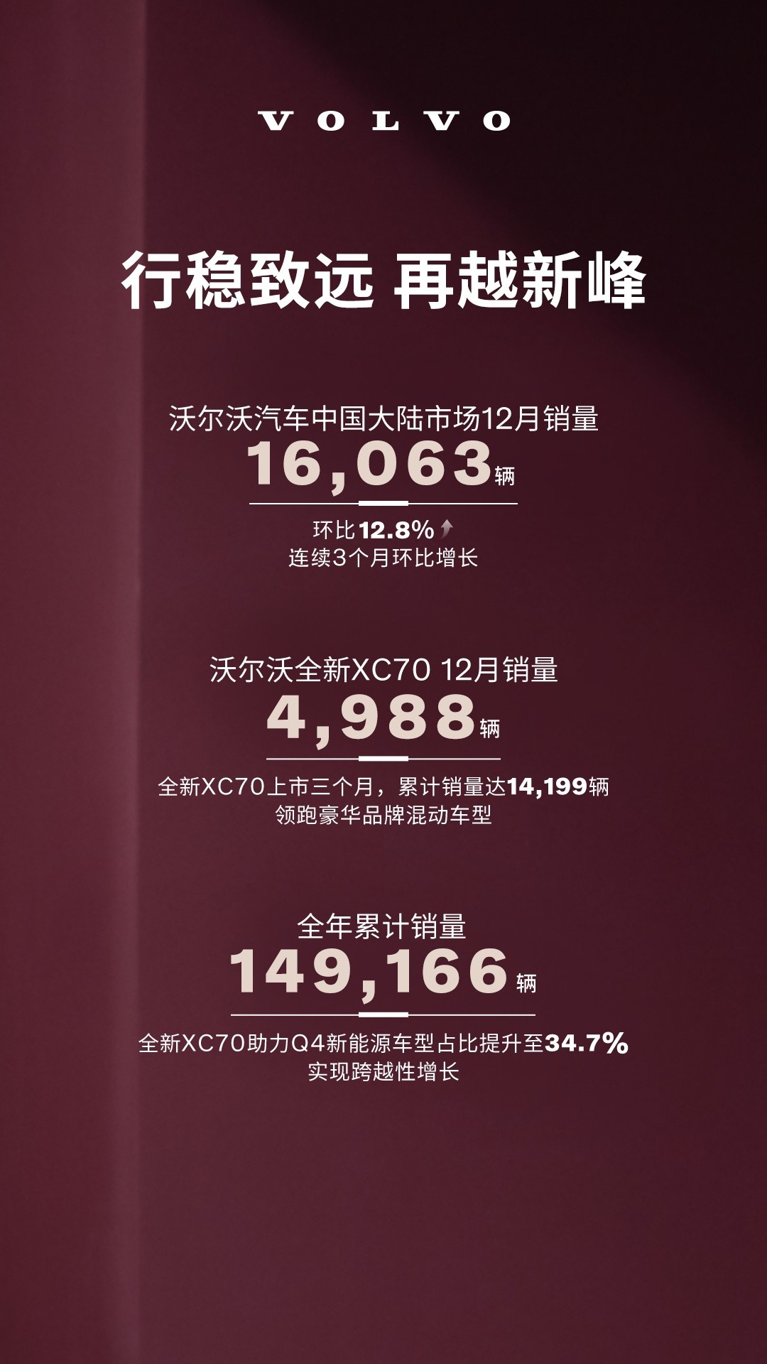 2025年12月,沃尔沃汽车公布了最新销量数据,中国大陆市场单月销量达16,063辆,环比增长12.8%。在竞争激烈的豪华车市场中,这一成绩显示了沃尔沃汽车非凡的品牌实力和持续增长的潜力。截至年底,品牌总销量顺利突破149,166辆,写下新的里程碑。