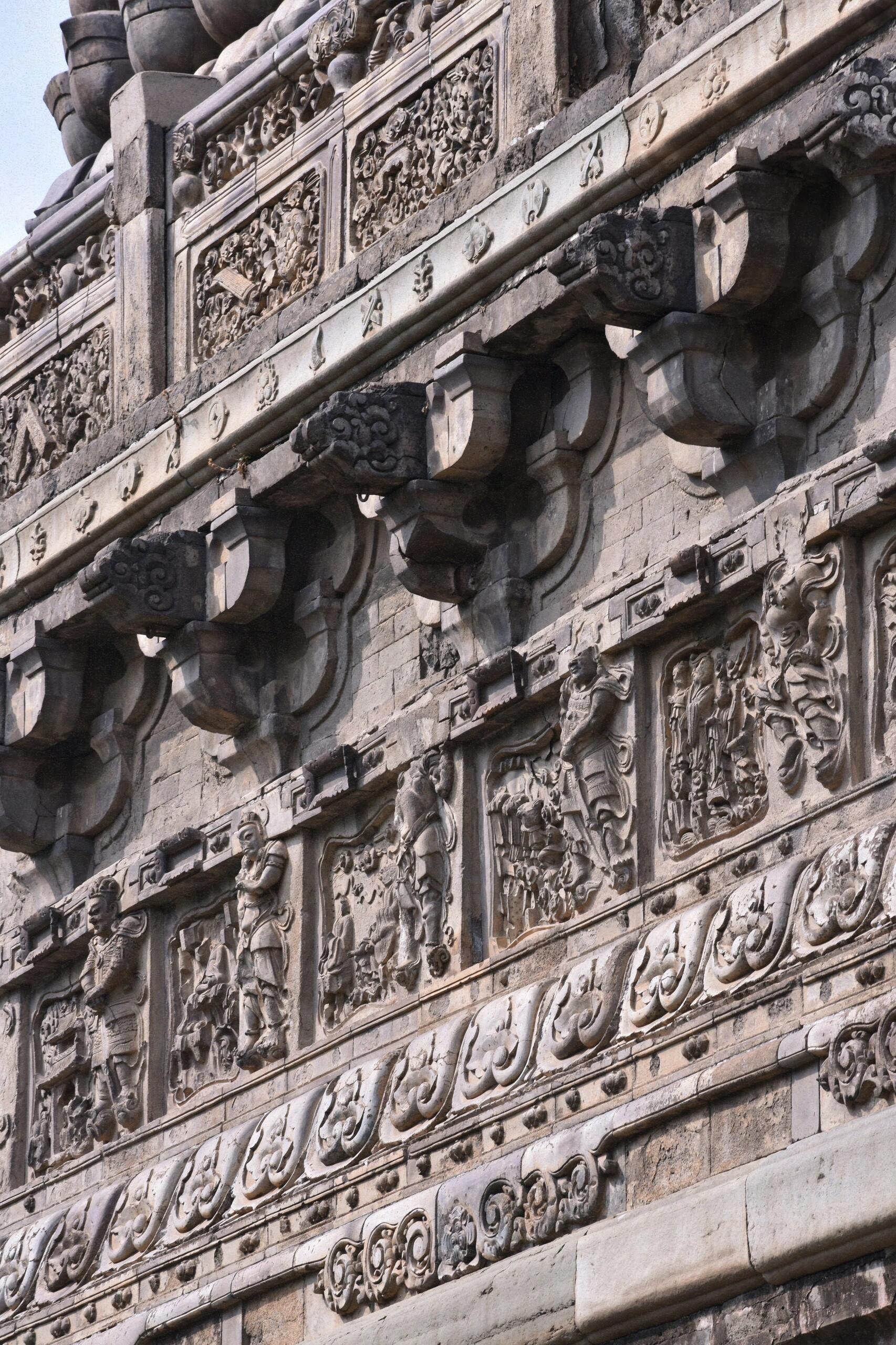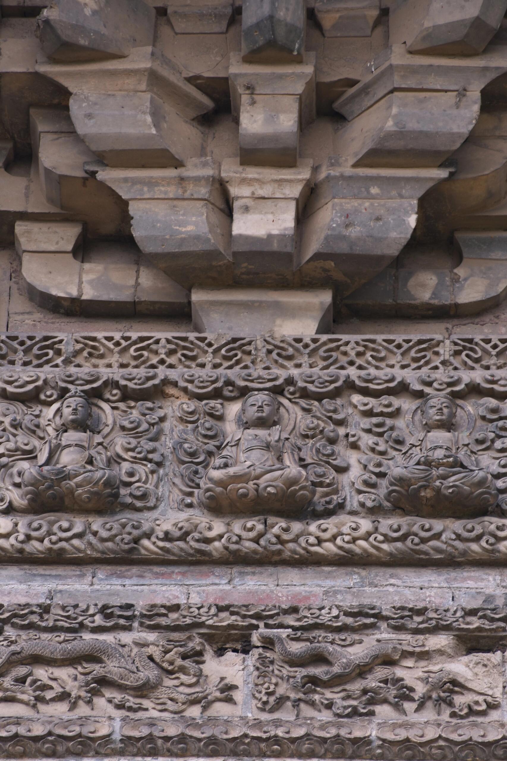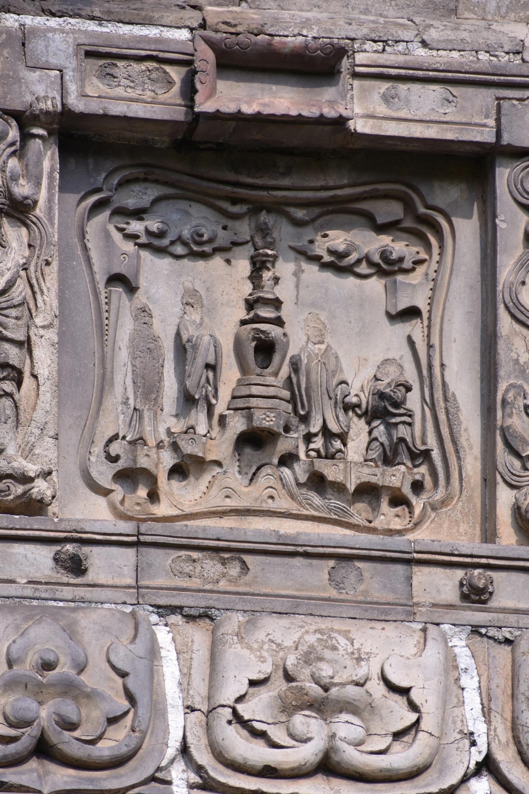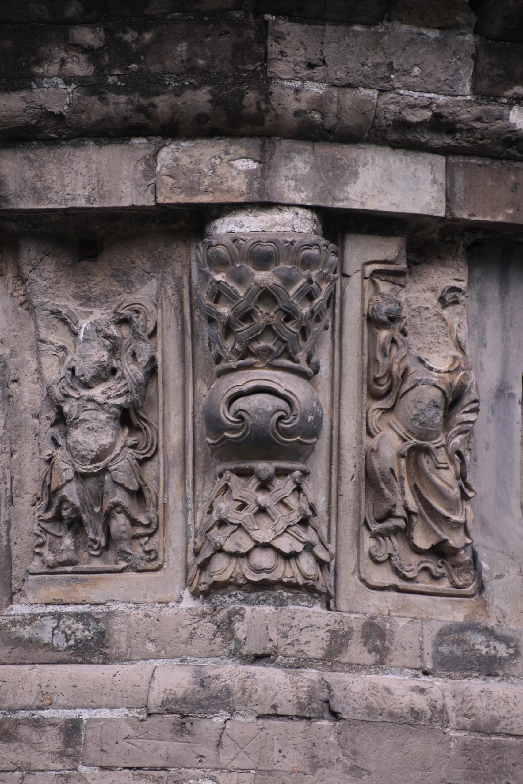塔基和塔身布满了精美的砖雕,这些砖雕题材丰富多样。有各种乐器,仿佛能让人听到悠扬的乐声;有庄严的佛像,面容慈祥,神态安详;有身姿曼妙的菩萨,手持法器,尽显神圣威严;还有灵动的飞天,衣带飘飘,仿佛正在空中飞舞。每一处砖雕都工艺细腻,线条流畅,无论是人物的表情、服饰的纹理,还是器物的细节,都刻画得栩栩如生。这些砖雕展现了明代官式建筑的精致水准,也反映了当时工匠们精湛的技艺和对艺术的执着追求。