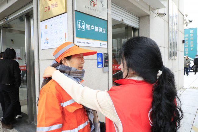 “阿姨,这围巾衬得您气色真好!现在虽然是春天了,可在外面扫地风还是大的,一定要围严实了。”志愿者陈丽娜一边帮环卫工人李大姐系围巾,一边贴心地叮嘱。