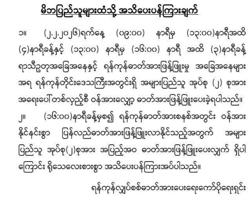 通告中指出,由于2月2日早上9点至下午1点,以及下午1点至4点期间,根据天气状况和仰光电力分配情况,对2个公众供电组进行了紧急轮流减负荷供电。