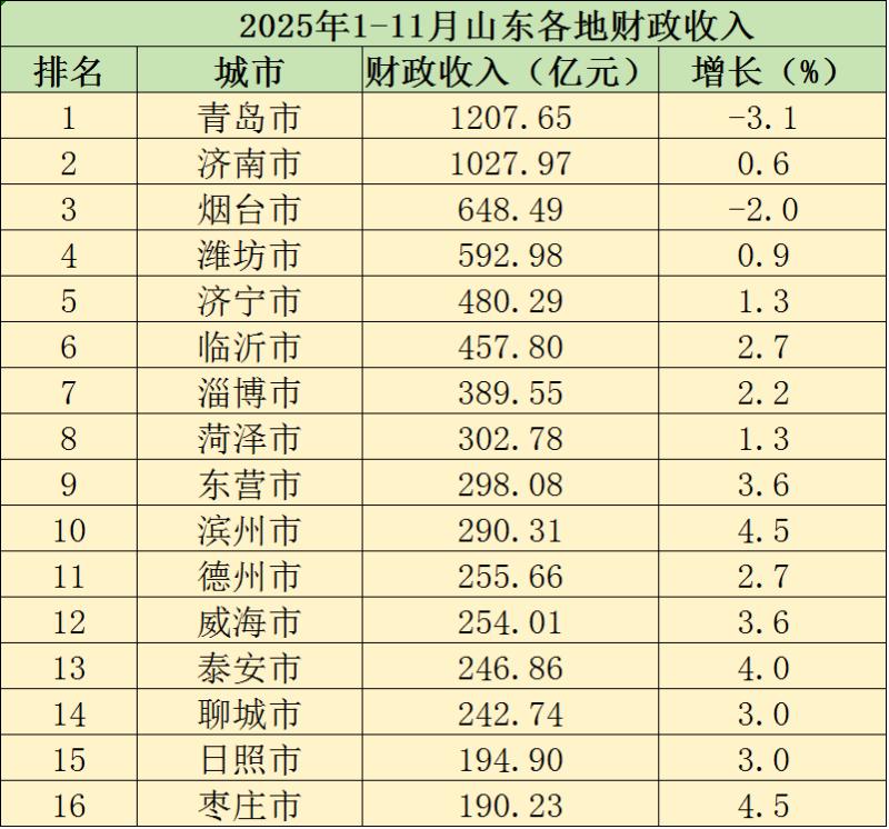 青岛市(1207.65亿)和济南市(1027.97亿)两地财政收入均在千亿级别。两地作为全省财政的重要部分,在财政增速上要更加快。济南1-11月财政收入增长0.6%,保持了较好的稳定。