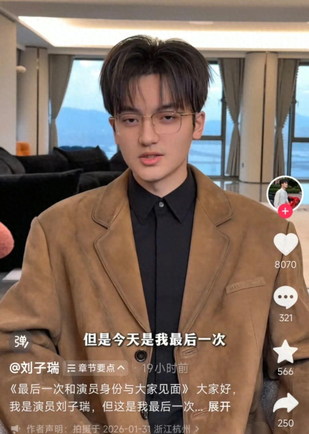 2月1日,27岁的刘子瑞发布专属退圈视频,标题直接拉满诚意——《最后一次以演员的身份告别,正式退圈》,语气平静却格外坚定,其中一句感慨更是戳中无数人:“聚光灯下的光环是虚幻的,真正的幸福是回家后的那盏灯”。