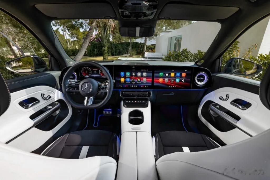 内饰设计摒弃了传统的风格,强调高科技感。可选的 MBUX 超级屏幕横跨整个仪表板宽度,包括一个 10.25 英寸的驾驶员座椅显示屏、一个 14 英寸的中央显示屏和一个 14 英寸的乘客显示屏。