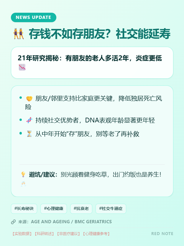 适用与避坑:倡导把人际关系视为与饮食、锻炼同等重要的养生要素:积极参与社区、培养爱好圈子、维持亲友联系都可视为为“长寿储蓄”做投入。对于独居或行动不便老人,社会应提供更多互动和支持渠道,以防止因孤独加速健康下滑。